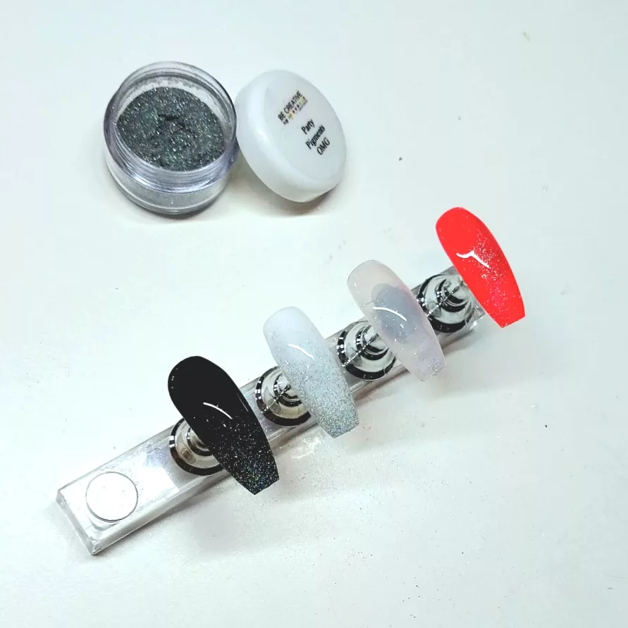 Login to see pricesOMG is from the Party Pigments collection of microfine glitters. This is colour that literally moves with the light as tiny particles of pigment, finer than sand, sit flat on the nail and reflect light, giving you the thinnest possible glitter effect with no added bulk! It can be used for chrome effect, donut nails, or as a strong colour over a dark gel base.